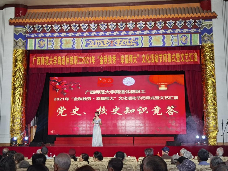 文艺表演中穿插了三轮党史、校史知识有奖问答环节,老同志参与的积极性高涨,再次把会场气氛推向了高潮。汇演在《八月桂花香》的歌声中落下帷幕,这首传唱大江南北红色经典歌曲凝聚了离退休教职工对党的一颗红心,抒发了对祖国和我校的美好祝福,表达了离退休老同志们对中国共产党建党100周年的深情祝福和民族复兴的伟大期盼,为整场演出划上了完美的休止符。