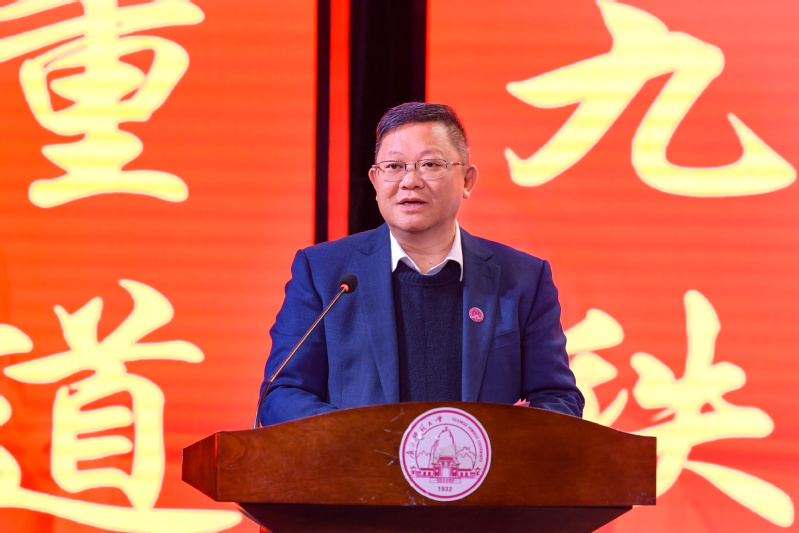 邓军代表学校党委向辛勤耕耘、努力工作的全体师生员工、离退休老同志、海内外校友致以节日的问候和美好的祝愿,向长期以来关心、支持、帮助广西师范大学建设发展的各级领导、广大校友、爱心企业及社会各界表示崇高的敬意和衷心的感谢,并号召全体广西师大人振奋精神、团结奋斗、以迎接90周年校庆为契机,加快“双一流”建设,实现内涵式发展,奋力谱写新时代国内高水平大学的崭新篇章。