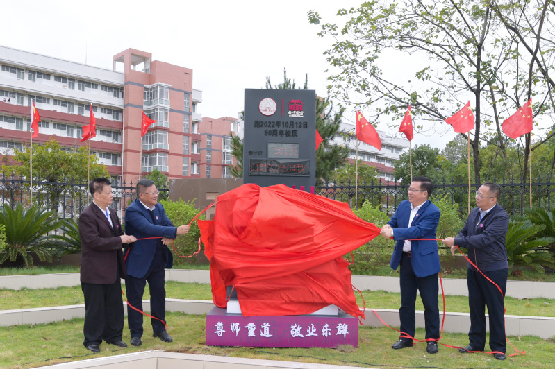 校党委书记邓军、校长贺祖斌与校友代表黄理彪、陈琳一同为校庆倒计时牌揭幕