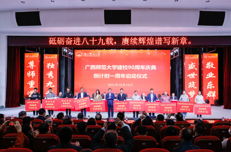 在我校90周年校庆倒计时一周年之际,中国银行桂林分行、中北兴业集团股份有限公司、桂林升华建筑有限公司、交通银行股份有限公司桂林分行、桂林独秀峰酒业有限公司、田家炳基金会、加拿大国际教育基金会暨中心、广西师范大学企业家校友联谊会、上海凡特实业有限公司等爱心企业、单位共支持1261万元人民币,助力教师教育发展等工作。