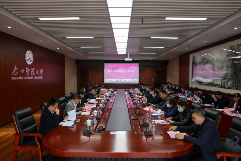 11月5日,学校依法治校委员会工作会议在雁山校区图书馆第二会议室召开,学校依法治校委员会全体成员参加会议,校党委书记、学校依法治校委员会主任邓军出席会议并讲话,校党委副书记、校长、学校依法治校委员会主任贺祖斌主持会议。