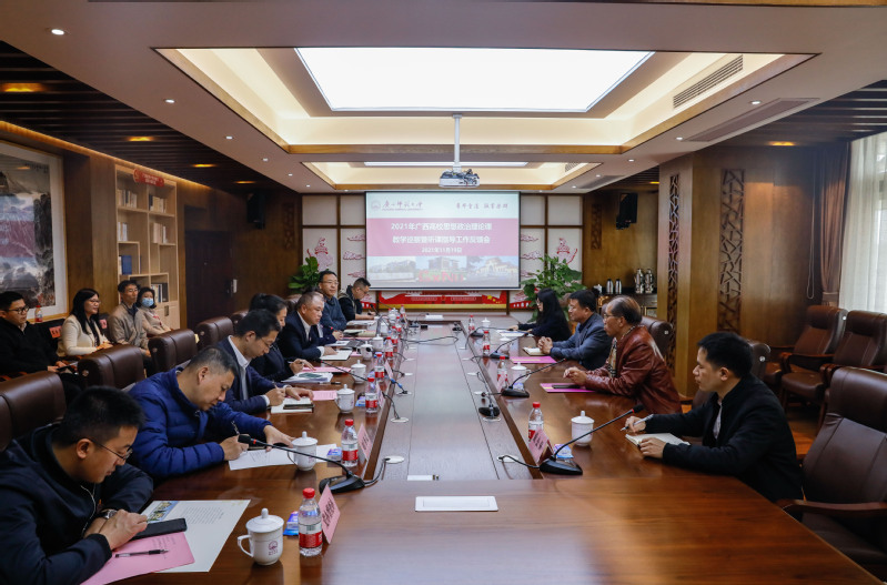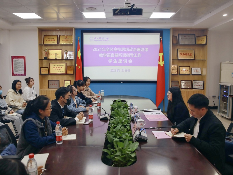 马克思主义学院相关负责人从六个方面就我校思想政治理论课程建设有关情况进行汇报,一是学校党委高度重视思想政治理论课教学,多措并举认真贯彻落实习近平总书记在学校思政课教师座谈会上重要讲话精神,取得显著成绩;二是出新招、出实招,认真贯彻落实习近平总书记视察广西时的重要讲话、重要指示精神,成效显著;三是创新教学模式,持续深化“四位一体”教学改革,成绩显著;四是注重加强师资队伍建设,打造一支教学科研水平一流的思政课教学团队;依托全国重点马院的平台优势,发挥示范引领辐射作用;存在不足及展望。