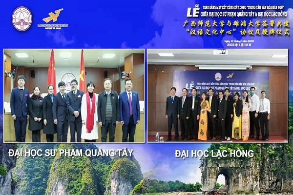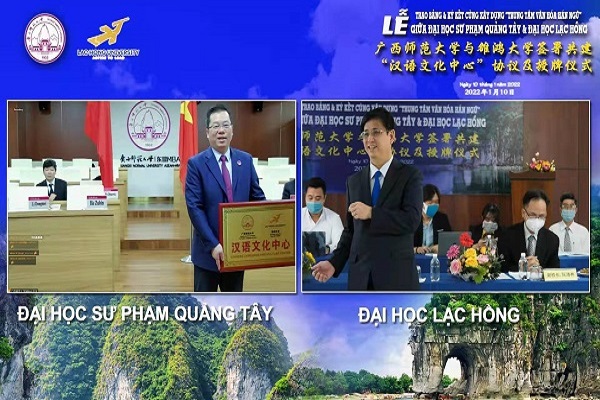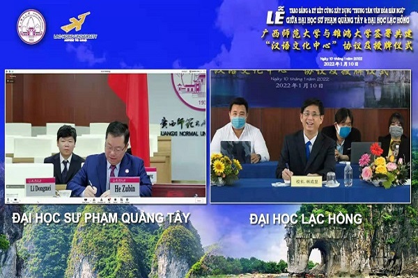 2022年1月10日,我校校长贺祖斌与越南雒鸿大学校长林成显通过网络连线方式,参加两校共建“汉语文化中心”签约及授牌仪式。国际合作与交流处处长/国际文化教育学院负责人主持签约仪式。