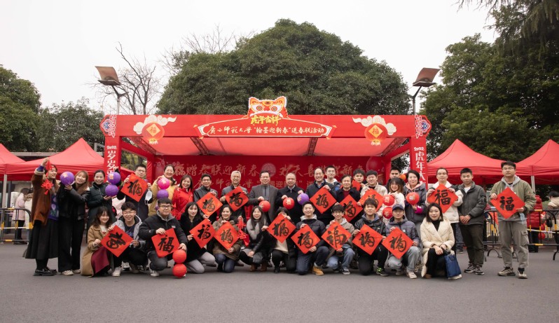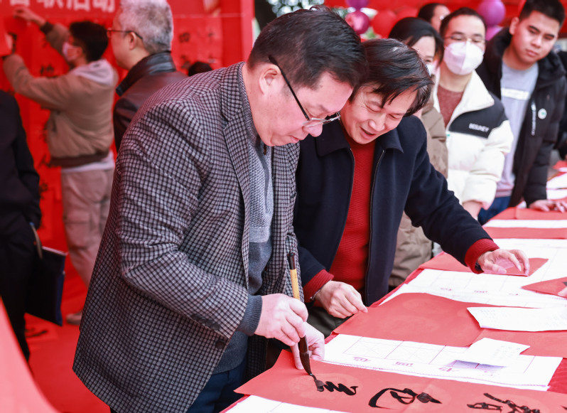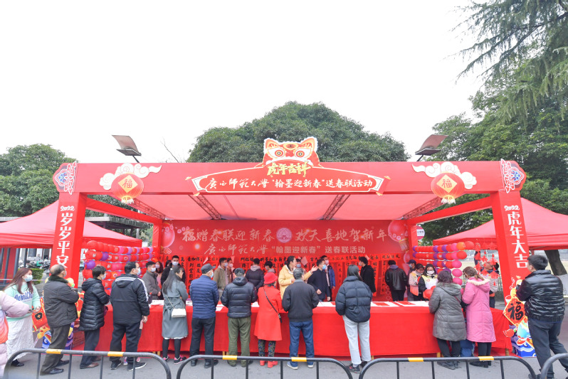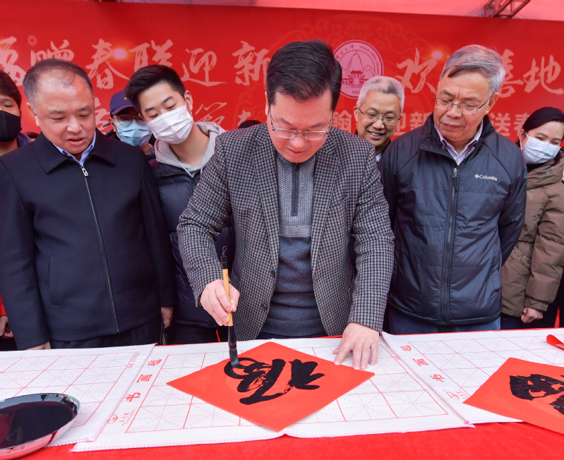 妙笔挥毫送祝福,翰墨飘香迎新春。1月14日,在新春佳节即将来临之际,我校宣传部/文明办、美术学院联合举办2022年“翰墨迎新春”现场送春联活动。校长贺祖斌现场挥毫泼墨,为我校师生员工、教职工家属送上亲手书写的对联和“福”字,校党委副书记赵铁一同到场,共同为我校师生送上新春祝福。现场前来领取春联的广大师生络绎不绝,争相选择自己喜欢的春联、福字和灯笼,整个现场喜气洋洋,福气满满。