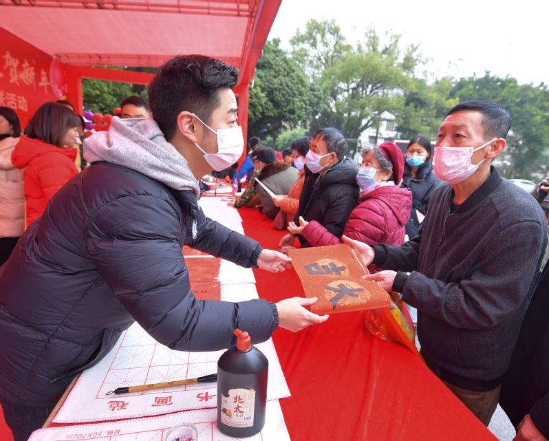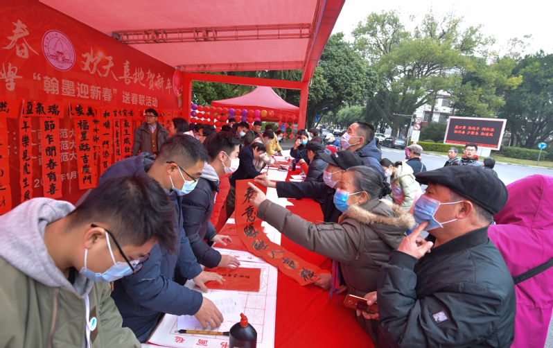 据疫情防控需求,本次活动特别邀请了我校老中青少不同年龄层次的书法家和书法专业学生提前书写春联,参加人员可直接现场领取春联、福字或灯笼。活动现场严格落实疫情防控措施,工作人员和志愿者提醒参加活动人员戴口罩,按照设置的1米间隔线有序排队领取,让大家在体验最地道年味气息的同时,时刻提醒大家疫情防疫不容忽视。