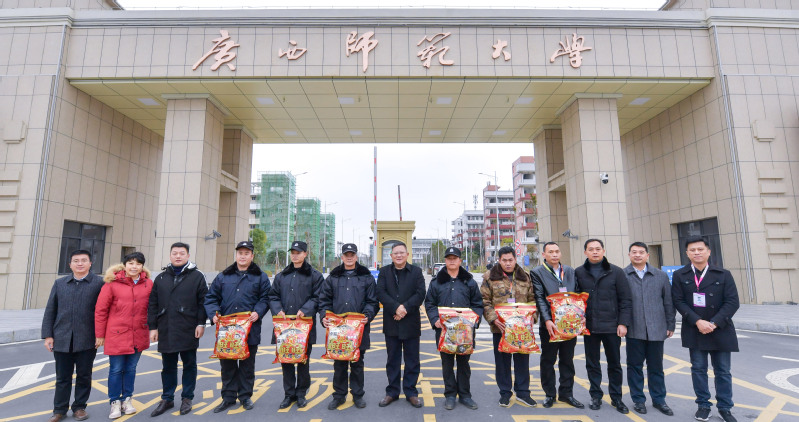 校党委书记邓军到雁山校区北大门为学校安保人员送上了新春的祝福和慰问品