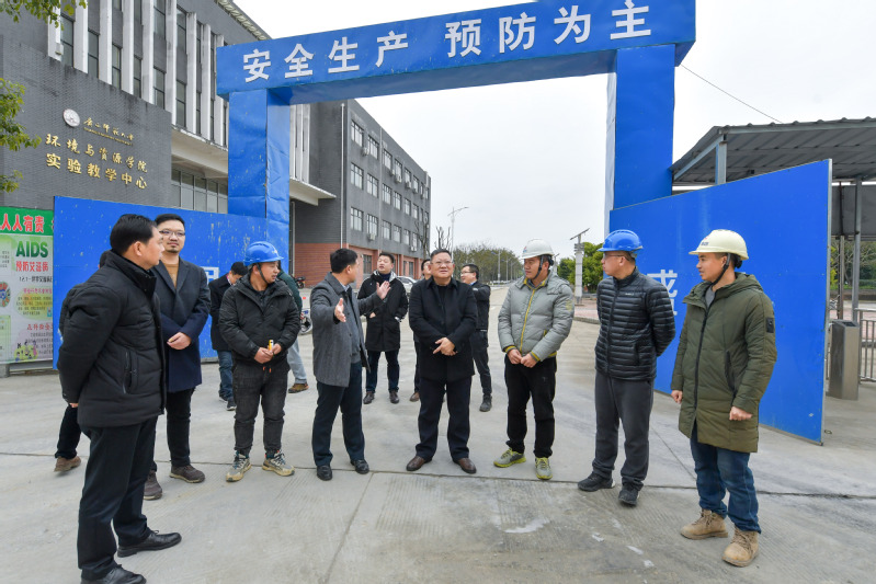 在视察雁山校区大学生创新创业中心工程、雁栖湖(防洪排涝)工程及湖岸周边环境整治工程时,邓军详细了解了项目建设进度,并向奋战在施工一线的工作人员送上亲切的问候和节日的祝福。邓军强调,今年是国家新百年征程的起步之年,也是学校建校90周年的大庆之年。不断完善学校基础设施建设,是加快建设幸福美好师大的重要基础保障,是进一步提升校园美誉度、展示学校高质量发展成果的重要抓手,也是广大师生对更美好的工作学习生活环境的热切期盼。相关职能部门和建设方要通力合作、各司其职、履职尽责,在确保质量确保安全的前提下加快项目进度,把好工程安全关、质量关、工期关,要以优异的建设成果迎接党的二十大召开,向学校建校90周年献礼。