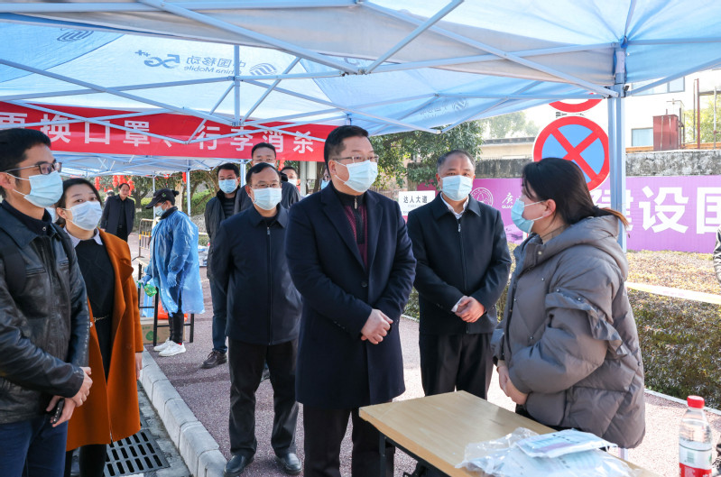检查中,邓军实地察看了雁山校区学生公寓和西大门、北大门报到点。报到现场的工作人员正有序地组织学生依次通过指定区域,学生们按照学校防疫要求依次排队进行检验入校,在学生公寓门口排队领取超市购物卡,返校现场井然有序。邓军来到校门报到点和学生宿舍区详细了解返校学生情况及学生疫情防控措施落实情况,与返校学生亲切交谈,要求有关部门继续落细落实疫情防控各项环节,在保证安全的前提下,为同学们在学校的学习生活提供更好的服务支撑。