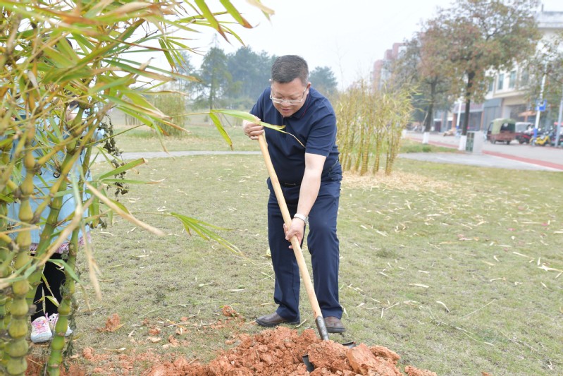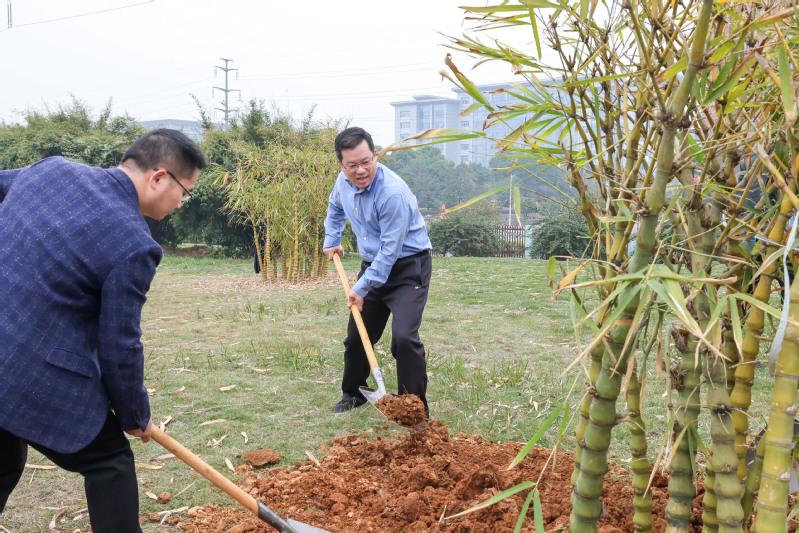 在雁山校区雁石林,在校后勤保障处/后勤服务集团领导干部和绿化专业人员的指导下,校领导、校党委常委携各组人员带头履“植”尽责,各组成员热情高涨,默契协作,有条不紊地开始了种植工作。大家不断挥揪铲土,夯实泥土,为苗浇水,将一株株郁郁葱葱的竹苗认真栽植在规划植树点上。一时间竹影、人影聚为一体,校园各处呈现春天的生机与欢乐。