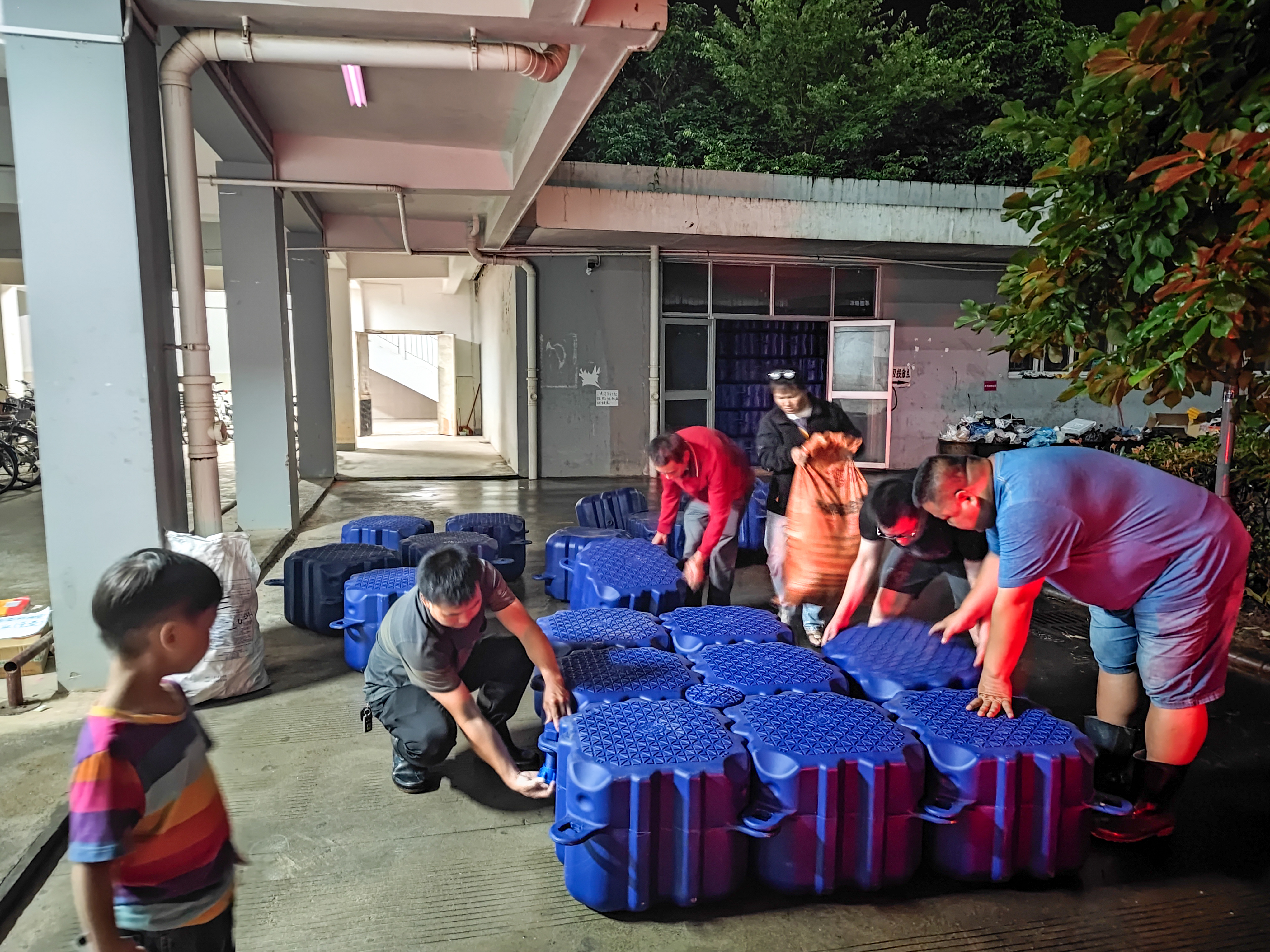 为保障师生生命财产安全,深夜的师大校园里仍有无数奔波的身影。体育与健康学院党员志愿服务队迅速集结,凝聚力量,将办公桌、座椅、乒乓球台、舞龙舞狮器材等放于地面易被水冲泡的物资搬运往高处,仅在一小时内高效率且高质量的完成了全部的搬运活动,保障大量学校公共财产安全;应生科院、环资学院、美术学院等院系需求,后勤保障处/后勤服务集团组织人员紧急搬运沙袋约500袋,在最快的时间建立好防汛屏障。
