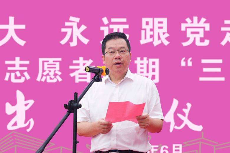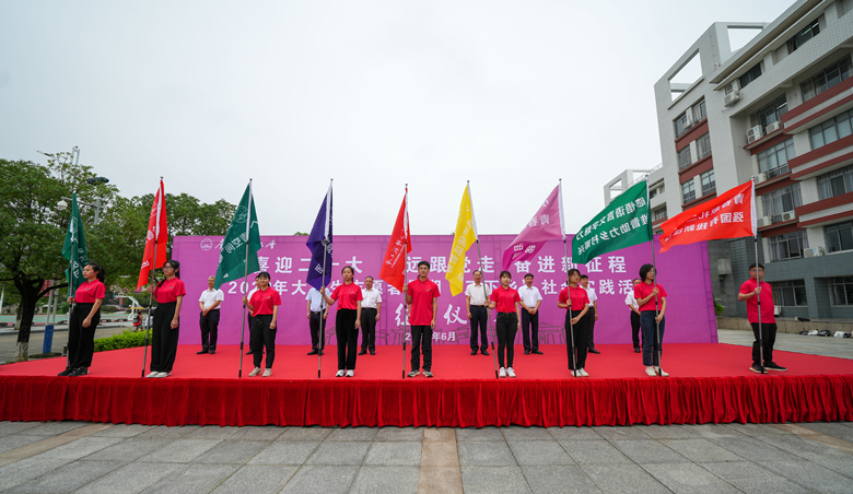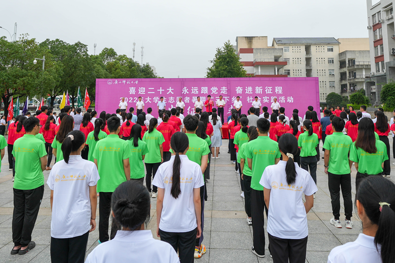 6月30日上午,学校在雁山校区起文楼北楼门前广场举行“喜迎二十大、永远跟党走、奋进新征程”——2022年大学生志愿者暑期“三下乡”社会实践活动出征仪式。全体在家校领导、校党委常委,相关职能部门主要负责人、各学院(部)分管学生工作党委副书记、团委书记、校团委全体干部、学校社会实践立项项目的指导老师和同学近200余人参加出征仪式。出征仪式由校党委副书记旷永青主持。