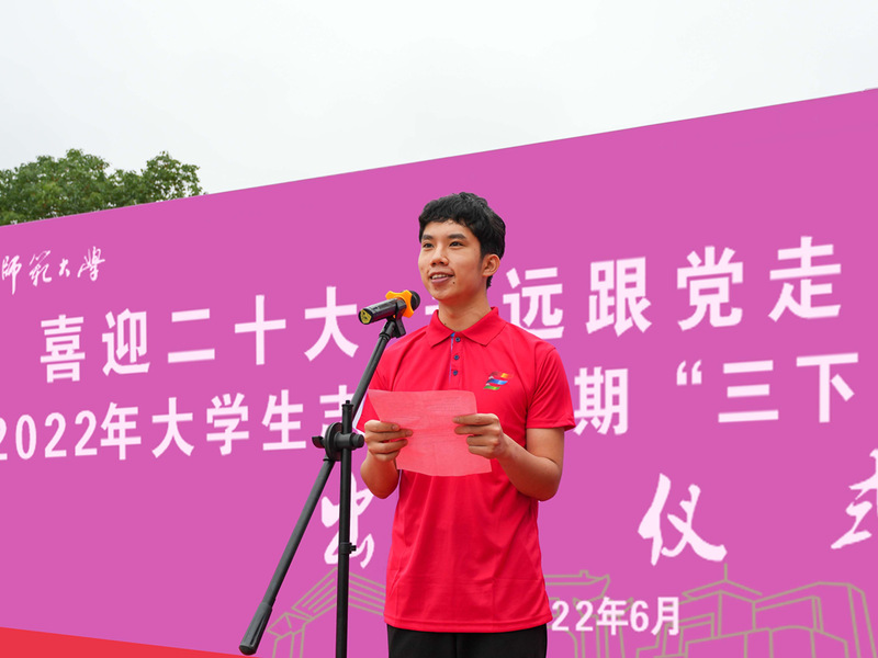 贺祖斌校长在讲话中表示,在全团上下深入学习贯彻习近平总书记在庆祝中国共产主义青年团成立100周年大会上重要讲话精神之际,在学校建校90周年校庆之年,我校青年学生传承学校光荣传统,深入各地开展社会实践,意义特殊,令人由衷欣慰。他向即将奔赴基层开展社会实践的青年师生提出了三点建议和希望:一是要寓思于行,坚定理想信念。大家要在助力乡村振兴中涵养报国之情,在把握国情中坚定理想信念,真正在实践中受教育、长才干、作贡献。二是要知行合一,练就过硬本领。大家要将书本知识与丰富实践结合起来,不断提高专业实践能力。三是要严于律己,树牢安全意识。严格遵守属地疫情防控要求,密切关注天气变化,加强安全保障,展现师大学子亮丽风采。