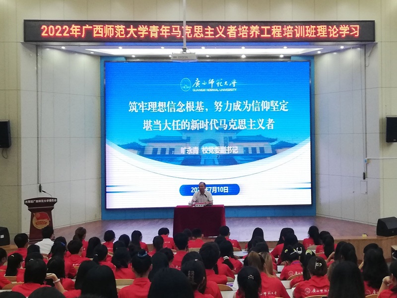 7月10日上午,校党委副书记旷永青在育才校区大学生学术报告厅,为我校第十六期青年马克思主义者培养工程培训班学员讲授题为“筑牢理想信念根基,努力成为信仰坚定、堪当大任的新时代马克思主义者”的专题课程。校团委全体专兼职团干、各学院(部)团委负责人及我校第十六期180余名“青马工程”培训班学员参加本次学习。