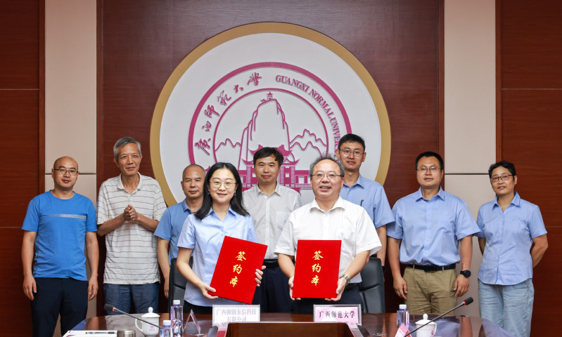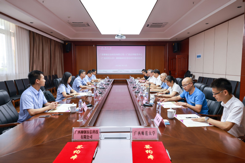 7月13日,广西应用数学中心(广西师范大学)与广西柳钢东信科技有限公司(以下简称“柳钢东信”)揭榜制科技项目合作签约仪式在我校育才校区举行。校党委常委、副校长黄文韬,柳钢东信党支部书记、董事长、总经理张海峰出席仪式并致辞。仪式由广西应用数学中心常务副主任主持。广西应用数学中心副主任、柳钢东信总经理助理刘超代表双方签署合作协议。广西应用数学中心(广西师范大学)、数学与统计学院、计算机科学与工程学院、网络信息中心主要负责同志,柳钢东信的相关人员参加活动。