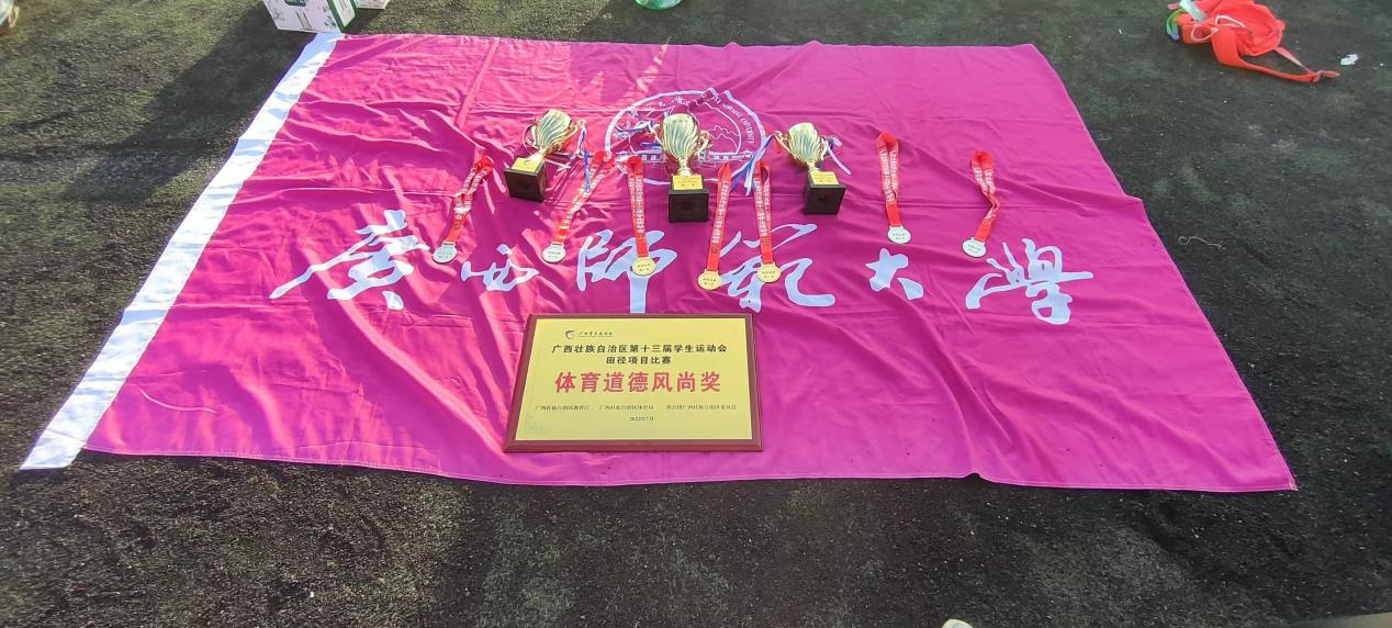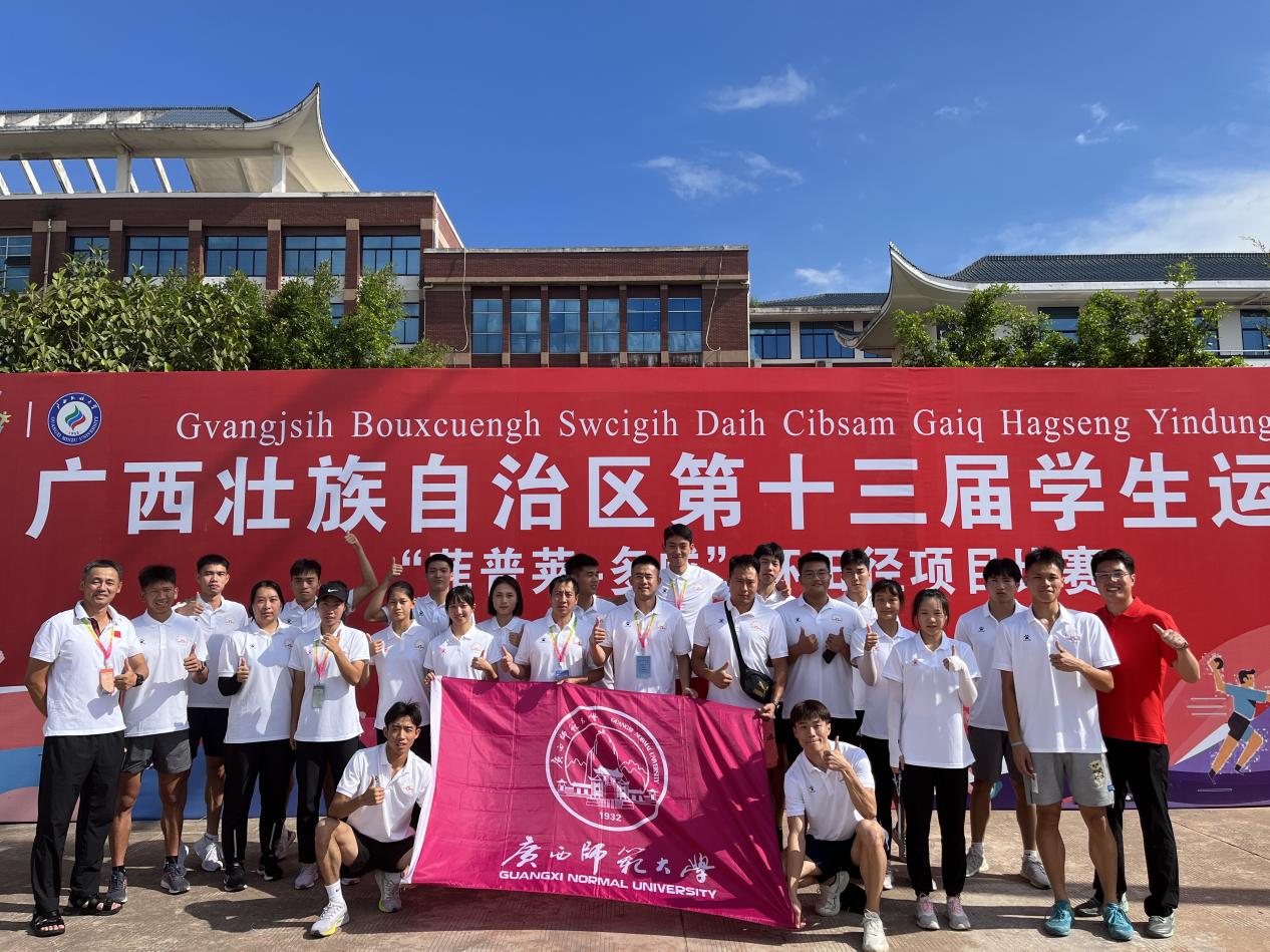 继上届学运会斩获第一,我校田径队在广西壮族自治区第十三届学运会上再创佳绩。优异成绩的背后,是学校对体育工作的高度重视,是各位教练员长期的辛勤付出,是各位运动员日复一日的努力拼搏。跑道铺就梦想,汗水书写荣耀。广西师范大学田径队正以朝气蓬勃的精神面貌和顽强拼搏的运动精神不断勇毅前行,力争在青春的赛道上跑出当代青年的最好成绩。