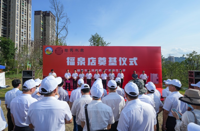 7月16日下午,独秀书房·福泉店奠基仪式在贵州省黔南州金山生态体育公园举行。福泉市人民政府副市长杨欣,福泉市文旅局党组书记、局长肖青华,广西师范大学党委副书记、校长贺祖斌,校党委副书记赵铁,校党委常委、副校长黄文韬,广西壮族自治区驻学校纪检监察组组长、校党委常委莫坷,校党委常委、总会计师李英利,校党委常委、组织部部长林国庆,校党委常委、统战部部长黄海波,广西师范大学出版社集团党委书记、董事长黄轩庄,福润集团董事长孙学标等领导出席了本次奠基仪式。仪式由校党委常委、总会计师李英利主持。
