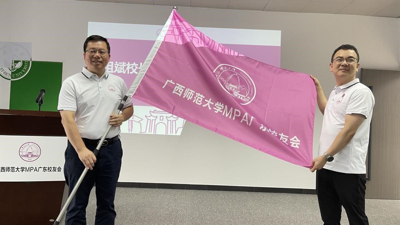 校友工作办公室负责人宣读了《关于同意成立MPA广东校友会的批复》。会议审议通过了广西师范大学MPA组织机构成员,与会领导、校友代表共同为MPA广东校友会揭牌,贺祖斌校长为MPA广东校友会授旗、赠送学校文创纪念品并为组织机构成员颁发了聘书。