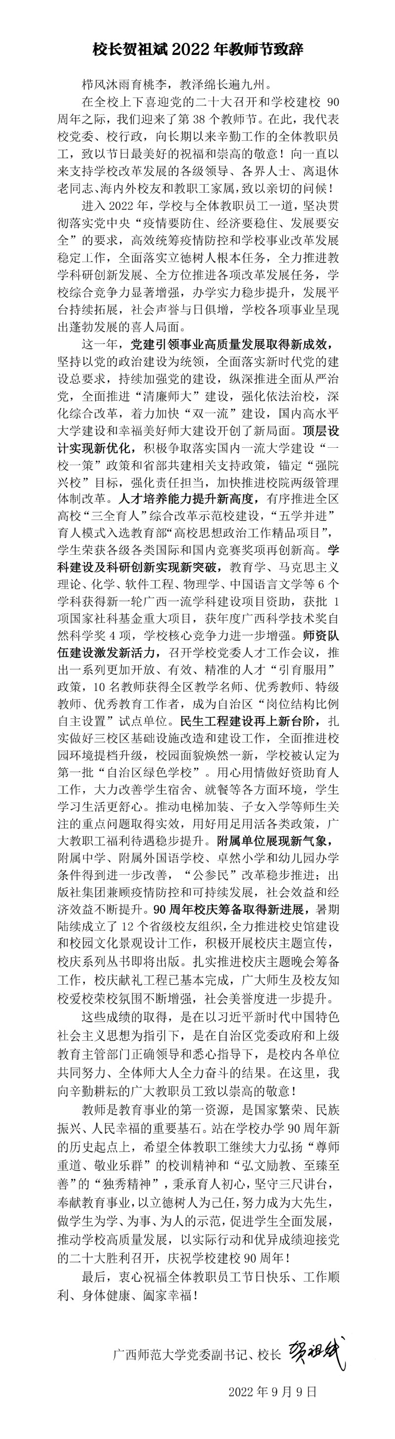 校长贺祖斌2022年教师节致辞