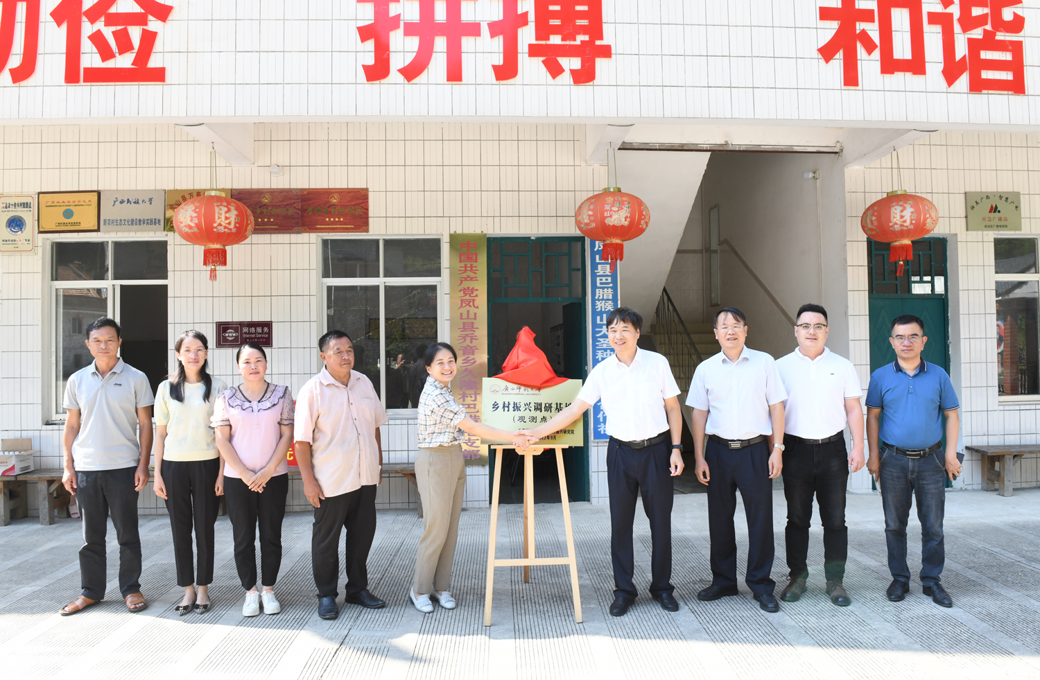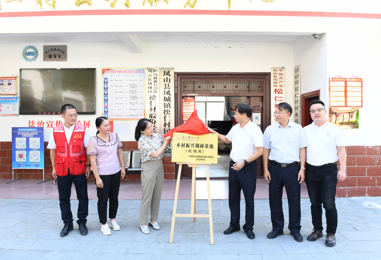 在凤山县凤城镇松仁村挂牌广西师范大学西部乡村振兴研究院调研基地观测点,我校党委常委、副校长黄文韬和凤山县副县长韦湘湘共同揭牌