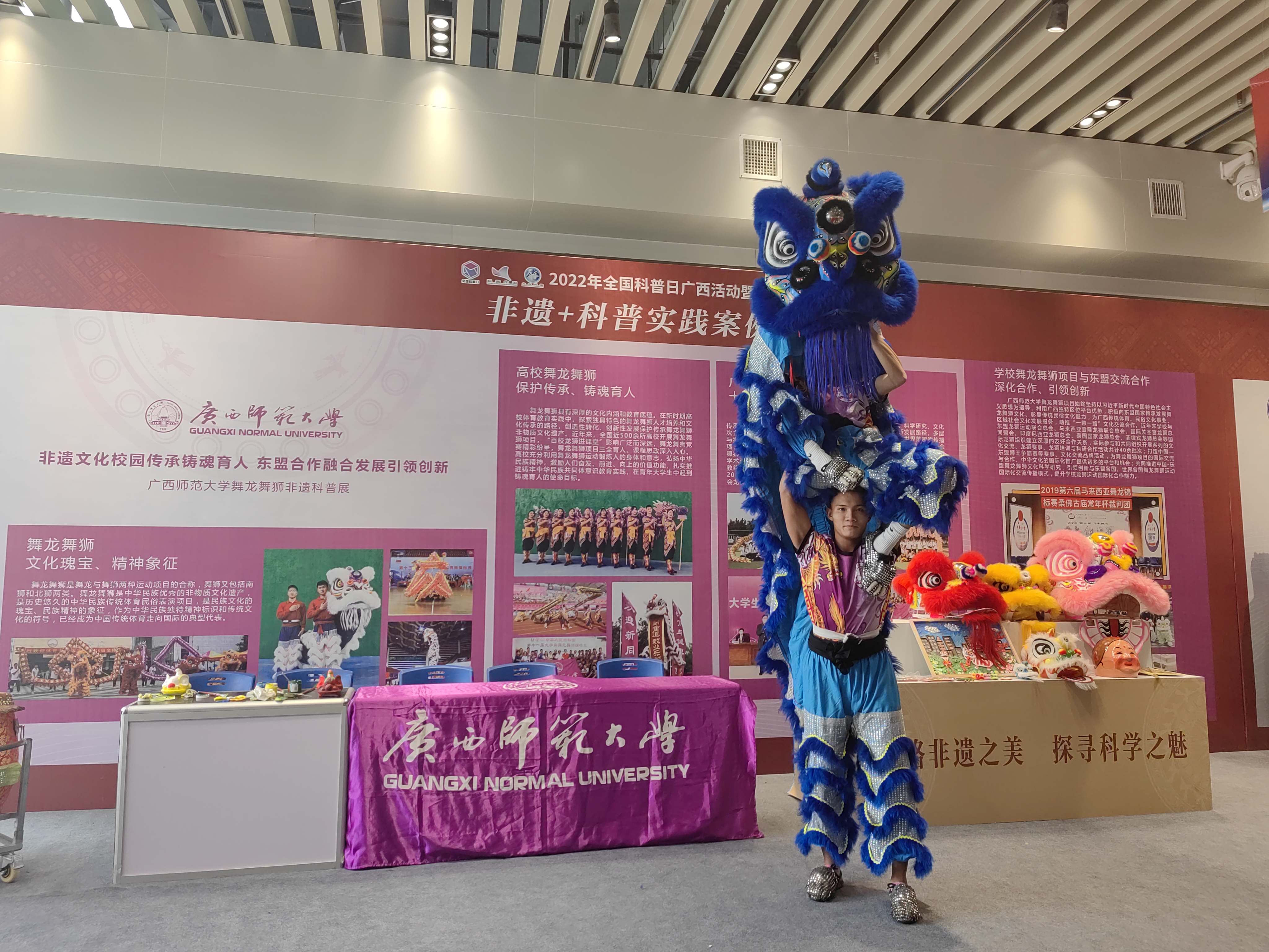 9月15日,由自治区科学技术协会、自治区党委宣传部等单位主办,广西科技馆、广西青少年科技中心、广西科普传播中心承办的2022年全国科普日广西活动暨“八桂科普大行动”在广西科技馆启动。广西青少年科学荟活动和2022“爱上非遗”科普展同日启动。我校舞龙舞狮项目以“非遗文化校园传承铸魂育人,东盟合作融合发展引领创新”为主题参加2022“爱上非遗”科普展。