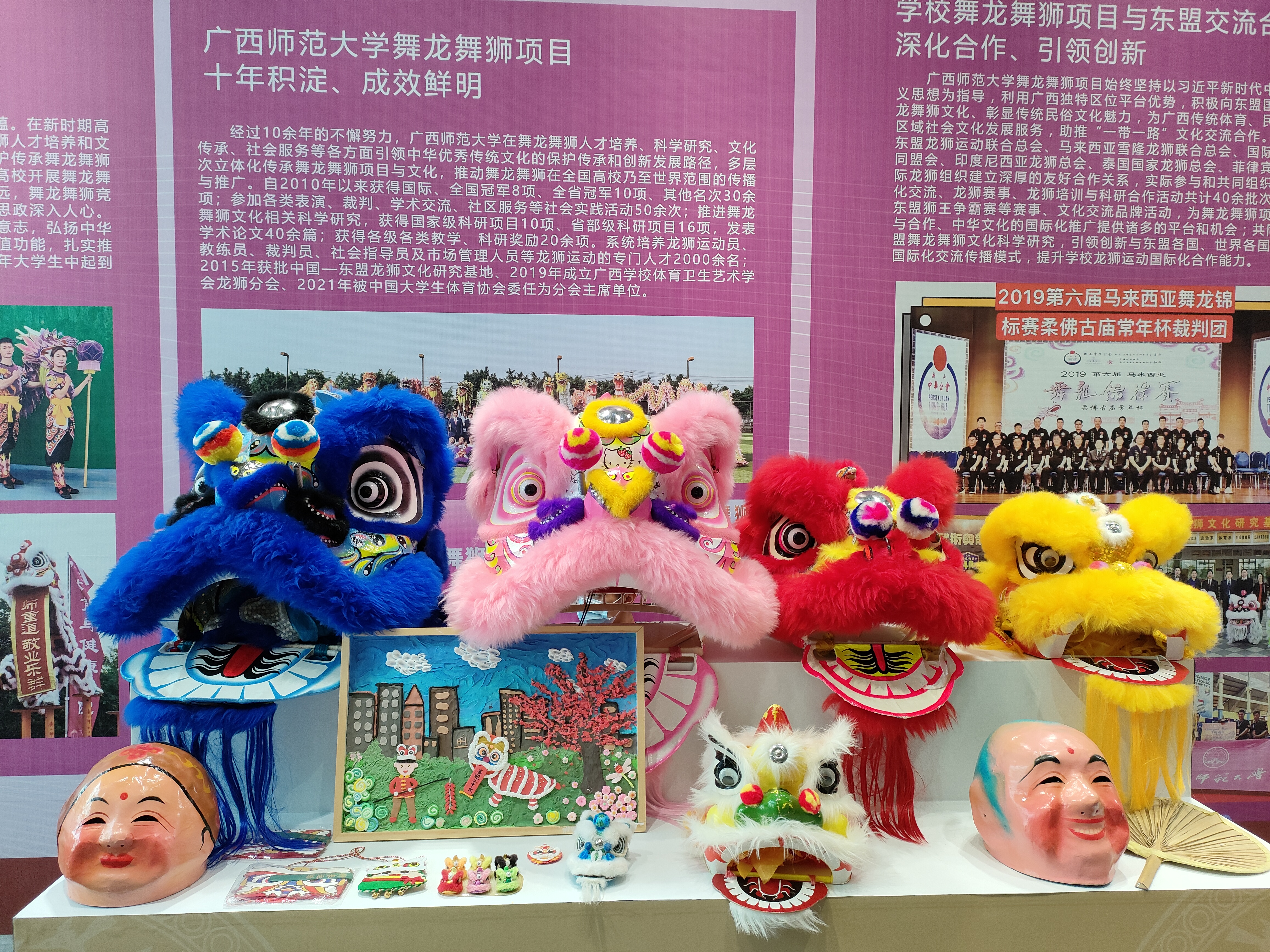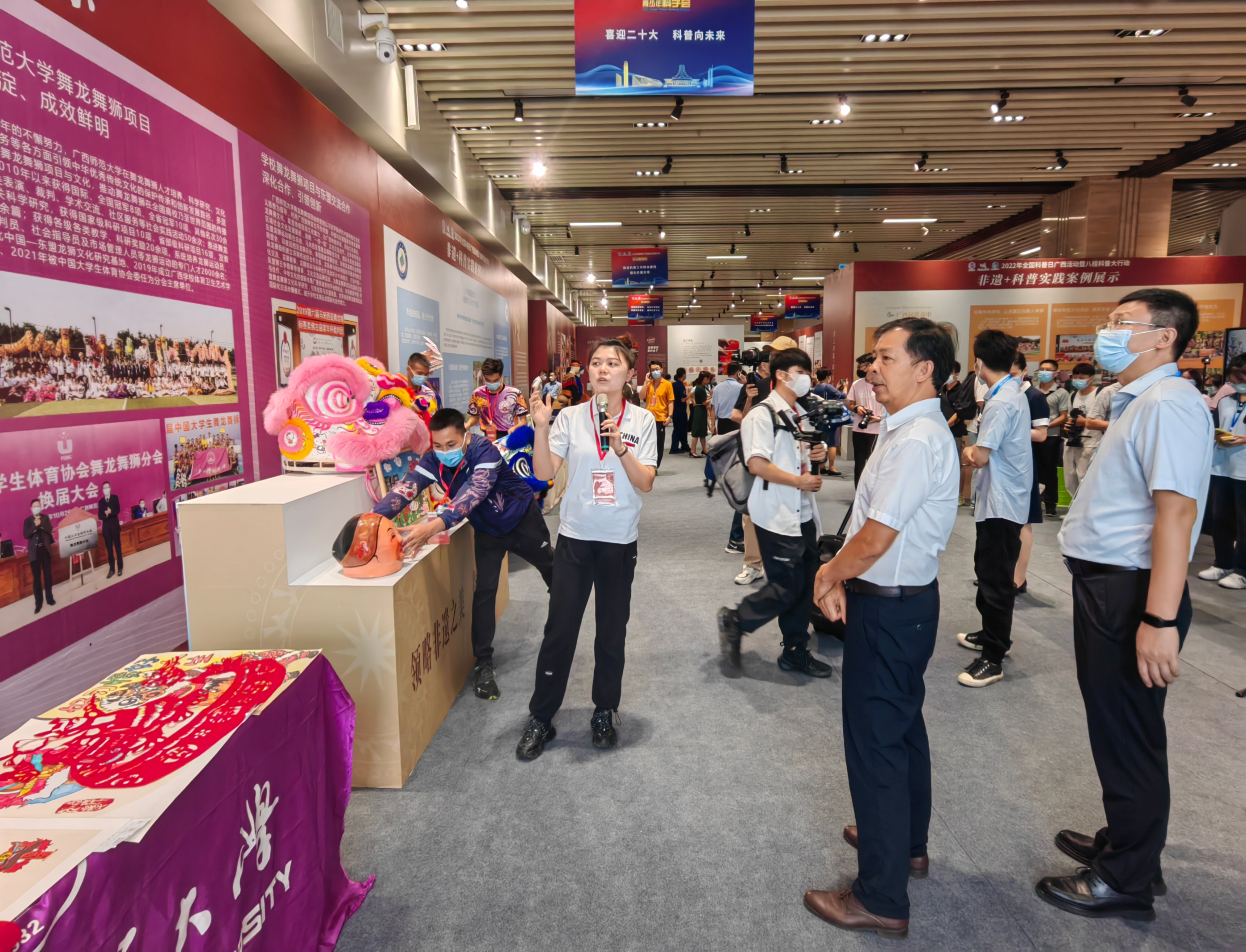 在非遗+科普实践案例展示区,我校围绕“舞龙舞狮—文化瑰宝、精神象征”“高校舞龙舞狮—保护传承、铸魂育人”“广西师范大学舞龙舞狮项目—十年积淀、成效鲜明”“学校舞龙舞狮项目与东盟交流合作—深化合作、引领创新”四个版块,全面展示了近十余年来学校舞龙舞狮项目在人才培养、科学研究、社会服务、文化传承创新、国际交流与合作等方面引领中华优秀传统文化的保护传承和创新发展路径。