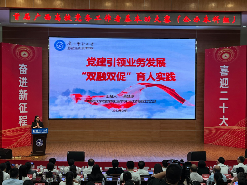 首届广西高校党务工作者基本功大赛(公办本科组)共吸引了来自全区25所公办本科高校的72名选手同台竞技各展风采,互相切磋各取所长。我校的3位参赛选手在党务知识测试、微党课、党建工作案例展示等3个环节的比拼中,充分展现了师大党务干部过硬的政治素养、扎实的理论功底、精湛的专业技能、优秀的职业素养和丰硕的党建成果,最终,蔡慧玲老师荣获教师党支部书记组一等奖、彭飞燕老师荣获学生党支部书记组二等奖、王金利老师荣获专职组织员组二等奖。蔡慧玲老师作为获奖代表在闭幕式上做党建工作案例展示。