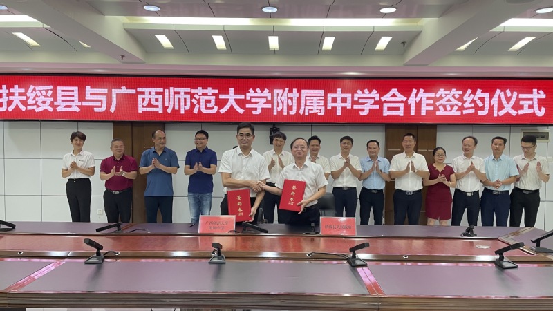 9月24日,我校附属中学与扶绥县人民政府就向扶绥县第三高级中学(以下简称扶绥三中)提供教育教学服务事宜举行隆重签约仪式。校党委常委、副校长黄文韬,扶绥县委书记黄建辉出席了签约仪式并讲话,学校基础教育管理办公室、附属中学负责人及扶绥县副县长黄芳妮,县政协副主席陈春红,县政府有关职能部门20余人参加了签约仪式。签约仪式在扶绥县人民政府四楼会议室进行,由县委副书记、县长许家恺主持。