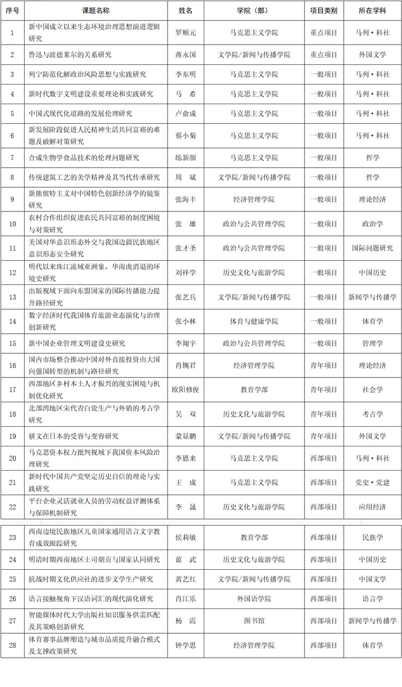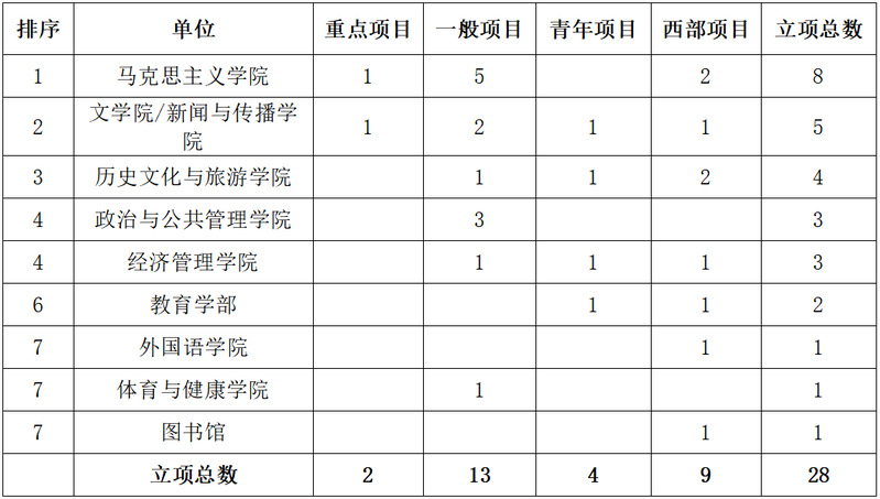 我校获得立项的28个项目分布于以下单位:马克思主义学院8项,文学院/新闻与传播学院5项,历史文化与旅游学院4项,政治与公共管理学院、经济管理学院各3项,教育学部2项,外国语学院、体育与健康学院、图书馆各1项。