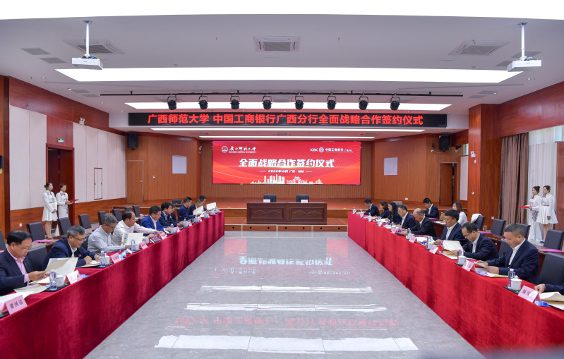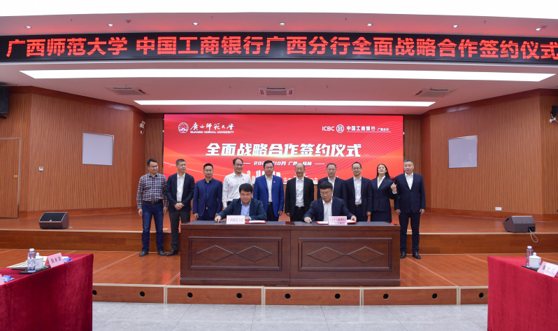 10月13日,为加快推进学校“双一流”和国内高水平大学建设,充分发挥中国工商银行品牌影响力和资源优势,持续推进信息化校园建设,共同推动金融科技与教育教学深度融合,促进产教融合高质量发展。广西师范大学与中国工商银行广西区分行全面战略合作协议签约仪式在我校育才校区举行。校党委副书记、校长贺祖斌,中国工商银行广西区分行党委书记、行长平凡出席仪式并致辞。仪式由校党委常委、总会计师李英利主持。