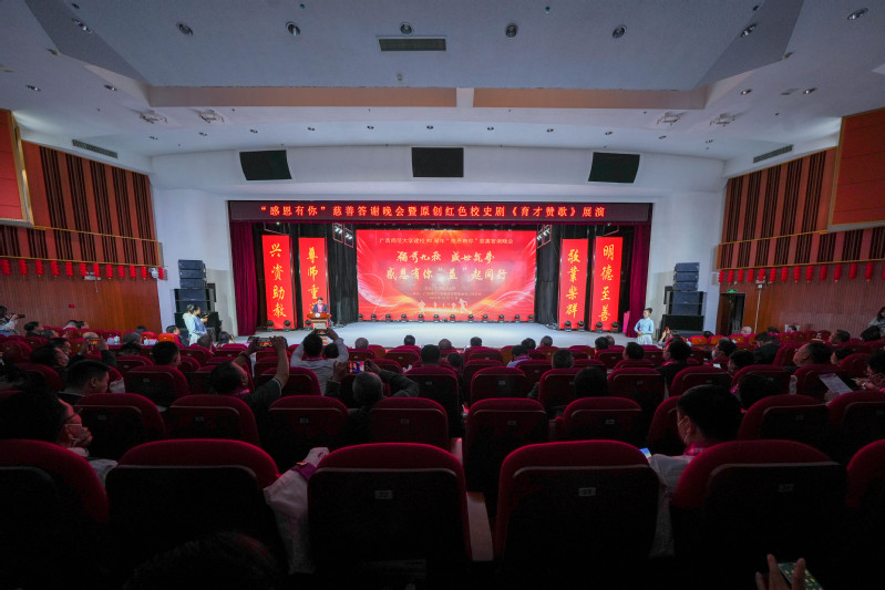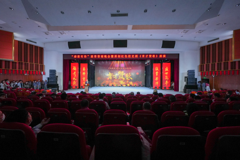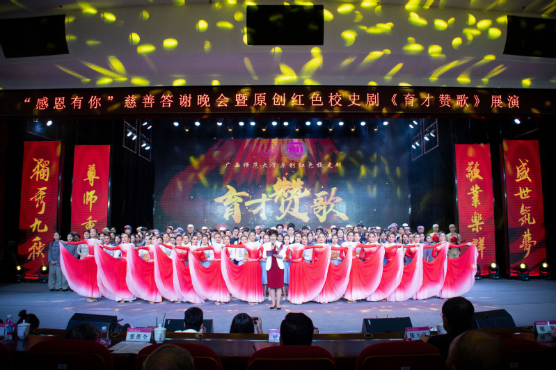 现场表彰鸣谢后,与会人员共同观看了原创红色校史剧《育才赞歌》,活动由校党委副书记旷永青主持。《育才赞歌》以学校历史发展为主线,以多元化的艺术表现形式,生动再现了学校红色校史中重要的历史人物和历史事件,展现了一代又一代广西师大人披荆斩棘、顽强拼搏的英雄史诗。该剧于2021年6月21日首演,已连续两年在校庆日上演,受到了师生、校友的一致好评,并成功入选2022年广西高校思想政治教育质量提升工程项目。