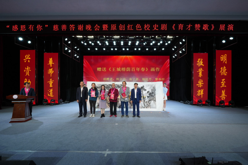 帅立功、帅民丹、秦子惠、黎秦汐等画家、校友向母校赠送共同绘制的《王城榕荫百年春》画作,学校党委副书记旷永青、副校长黄文韬共同为他们颁发捐赠证书