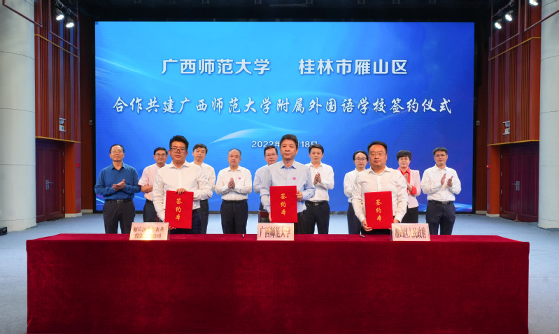 我校与桂林市雁山区合作共建广西师范大学附属外国语学校,是学习贯彻落实党的二十大精神的具体行动,将进一步深化校地合作,进一步优化全市教育布局,促进基础教育优质均衡发展,推动雁山区高品位发展。