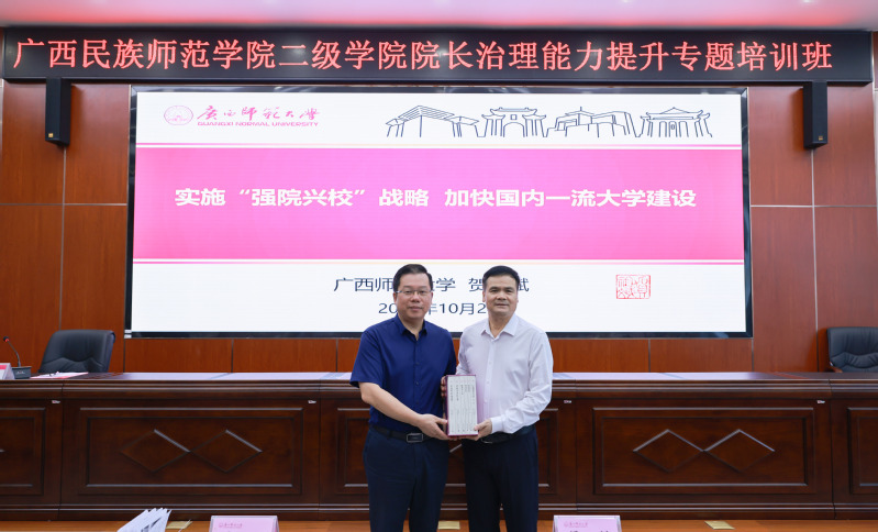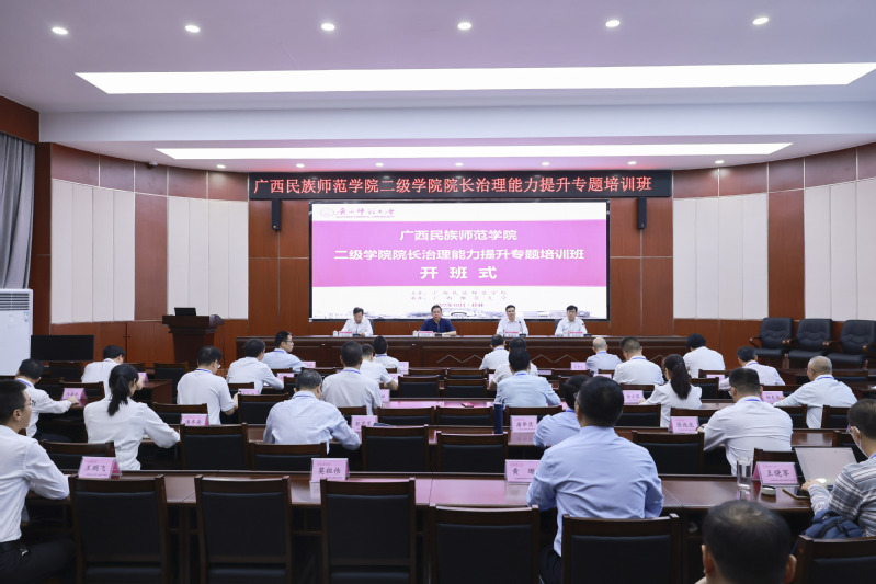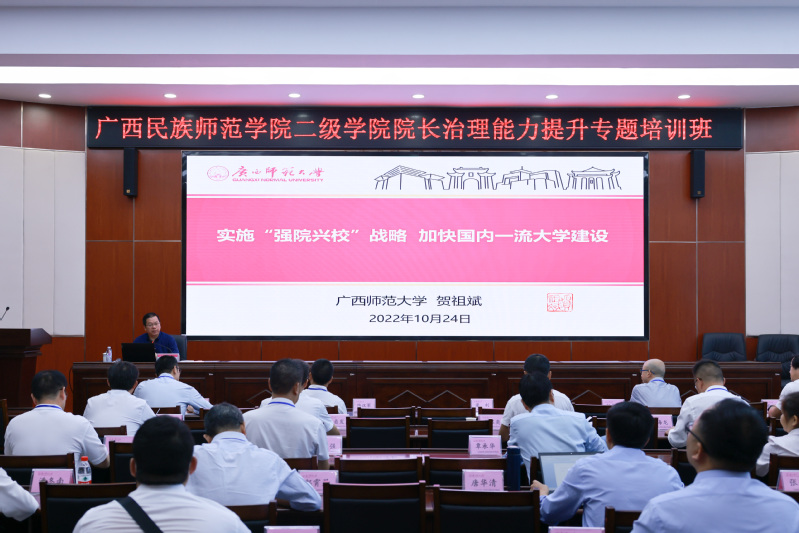 10月24日,由广西民族师范学院主办、广西师范大学承办的广西民族师范学院二级学院院长治理能力提升专题培训班在我校育才校区顺利开班。我校校长贺祖斌出席开班仪式并代表学校致辞。广西民族师范学院党委书记梁远海、党委副书记韦永恒、党委常委、组织部部长杜向武以及各二级学院负责人近40人参加培训。