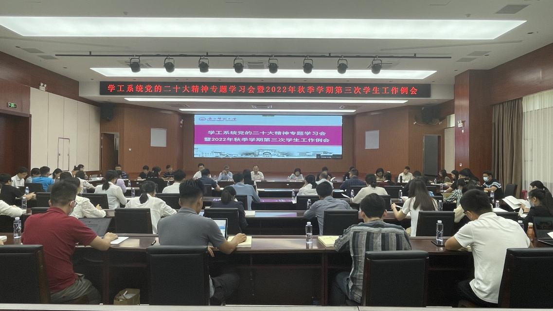 10月26日上午,我校在育才校区国教中心2号楼201报告厅召开学工系统党的二十大精神专题学习会暨2022年秋季学期第三次学生工作例会。校党委副书记旷永青出席并主持会议。各学院(部)分管学生工作党委副书记、辅导员代表以及学工部(处)、研工部、校团委全体干部参加会议。