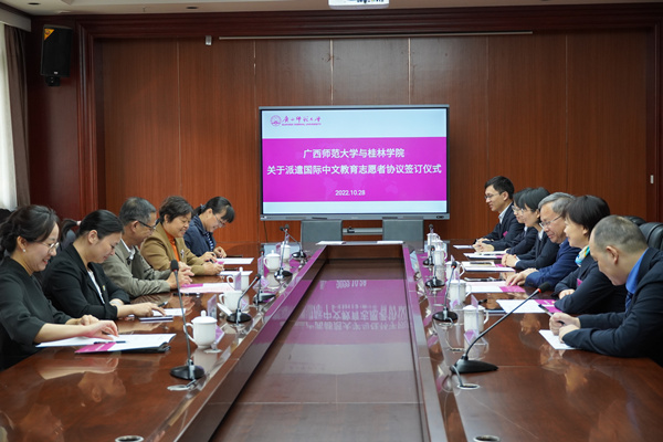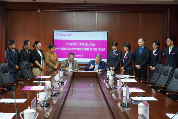 10月28日上午,为支持国际中文教育发展,我校与桂林学院就派遣桂林学院汉语国际教育专业应届毕业生到广西师范大学合作共建的泰国宋卡王子大学孔子学院、印度尼西亚玛琅国立大学孔子学院以及越南河内大学孔子学院担任国际中文教育志愿者的事宜签订《广西师范大学与桂林学院关于派遣国际中文教育志愿者协议》。我校党委常委、副校长苏桂发,桂林学院校党委副书记、校董事、校长杨树喆出席仪式并致辞。