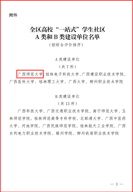 近日,根据自治区教育厅下发的《桂教思政〔2022〕27号自治区教育厅关于公布第一批全区高校“一站式”学生社区建设A类和B类单位名单的通知》(桂教思政〔2022〕27号),我校获第一批全区高校“一站式”学生社区建设A类单位,是七所A类建设单位之一。