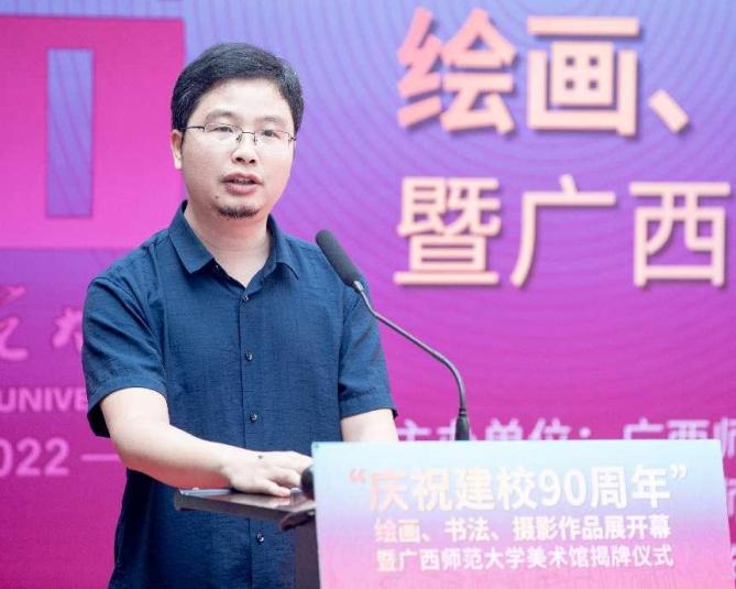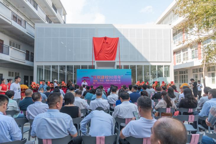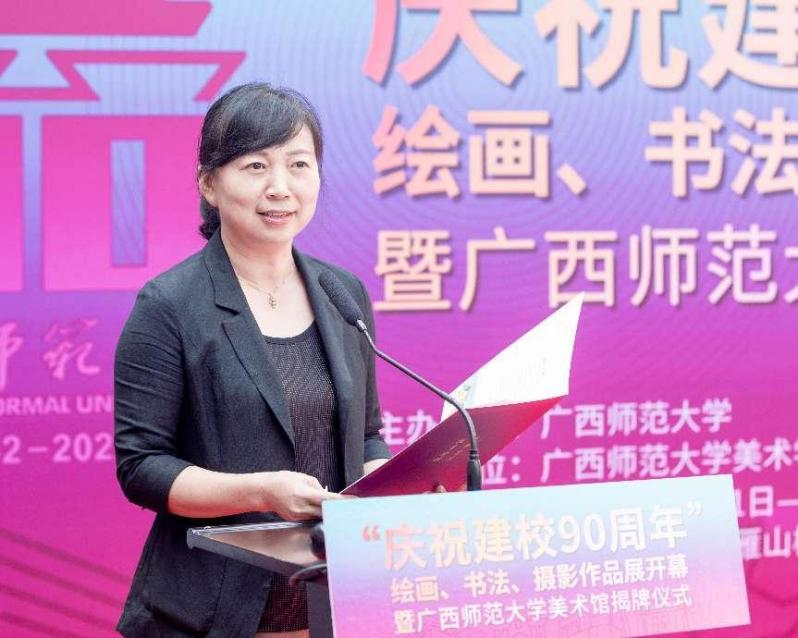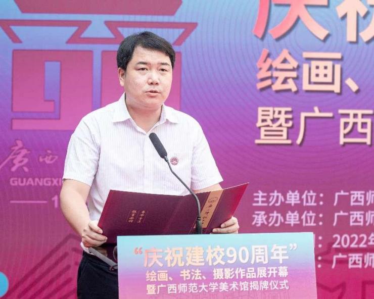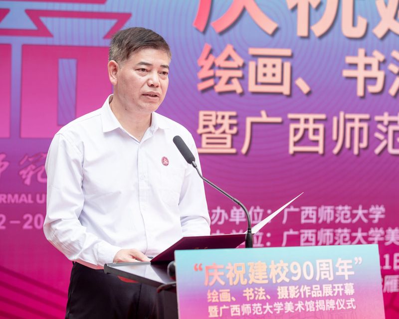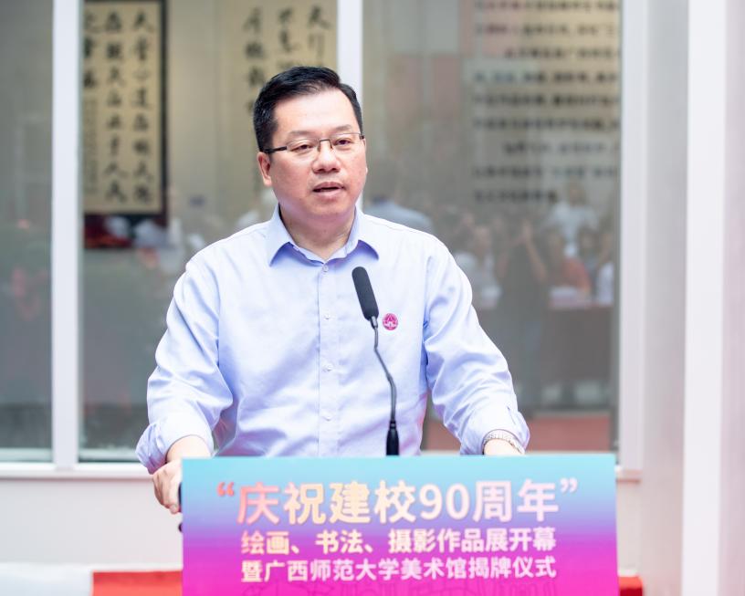 11月11日上午,我校“庆祝建校90周年”绘画、书法、摄影作品展暨广西师范大学美术馆揭牌仪式在雁山校区纯道楼启动开幕。校党委副书记、校长贺祖斌,自治区纪委监委驻校纪检监察组组长、广西师范大学党委常委莫坷,校党委常委、总会计师李英利,广西师范大学原副校长、桂林市美术家协会名誉主席白晓军,桂林美术馆书记邱丽萍、各学院(部)、各单位(含附属单位)负责人、美术学院师生以及校友代表出席作品展开幕及揭牌仪式。