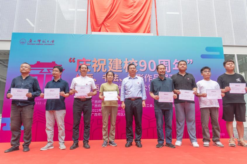开幕仪式上,莫坷组长宣读了“广西师范大学‘庆祝建校90周年’绘画、书法、摄影作品展”优秀作品奖名单,贺祖斌校长向优秀作品奖作者代表颁发荣誉证书。