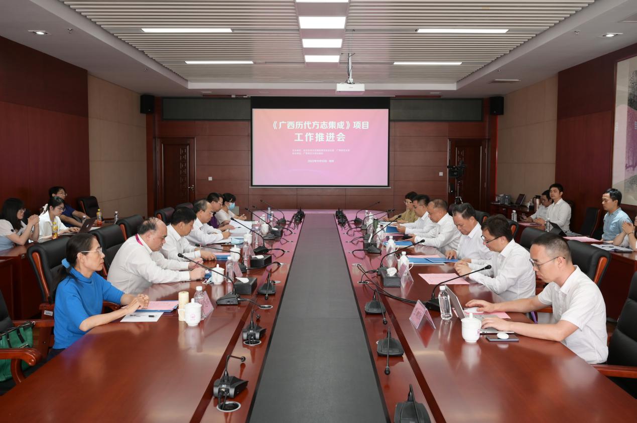 当天下午,《广西历代方志集成》整理出版工作项目工作推进会对项目工作作了整体部署。会议由自治区地方志办副主任唐中克主持。会上,广西师范大学出版社文献分社社长鲁朝阳、广西人民出版社地方志年鉴出版中心副主任韦洁琳分别就项目工作计划、工作进度、存在的问题与困难等情况做了汇报发言。与会领导、专家就项目的实施推进工作进行了研讨,并对下一步的工作开展进行了部署。会议一致认为,要在自治区政府的关心和支持下,充分整合资源,联动协同实施,科学统筹推进,切实将《广西历代方志集成》整理出版项目打造成为广西历史文化的名片工程、标杆工程和新时代古籍出版的精品工程。