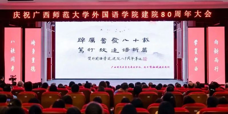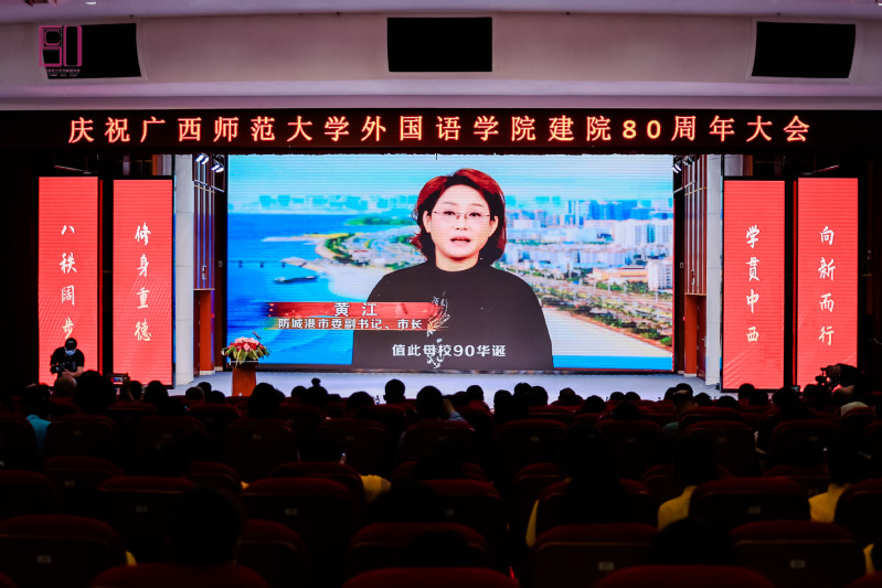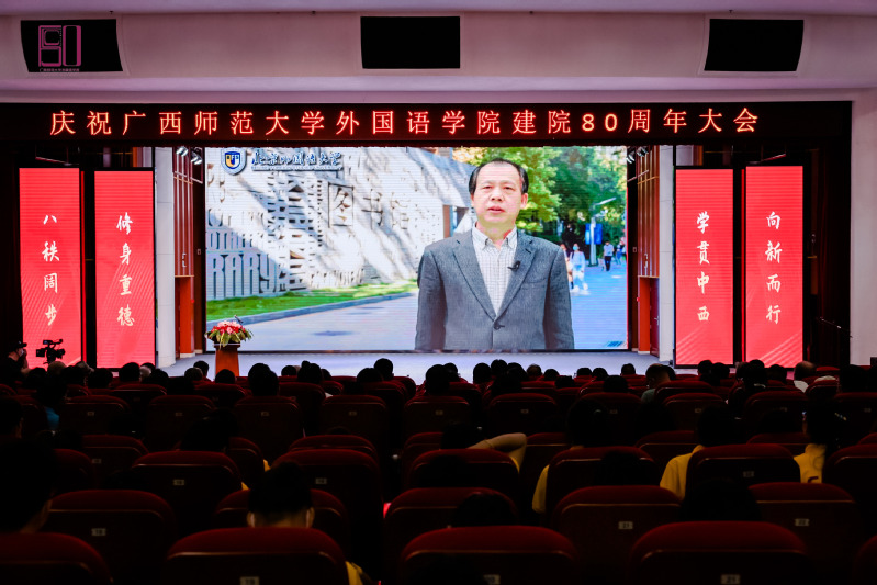 踔厉奋发八十载,笃行致远谱新篇。在全国上下深入学习贯彻党的二十大、二十届一中全会精神,在学校喜庆建校90周年之际,11月13日上午,庆祝广西师范大学外国语学院建院80周年大会举行。校党委副书记、校长贺祖斌,校友、自治区司法厅党委书记、厅长林金文,校党委常委、副校长苏桂发,自治区纪委监委驻广西师范大学纪检监察组组长、校党委常委莫坷,学校原副校长、外语系主任张金长,校友、自治区教育厅对外合作与交流处处长罗耀光,校友、广西本科高校英语教学指导委员会主任委员、南宁师范大学外国语学院院长李晓,校友、防城港市中级人民法院原副院长周忠,防城港市贸促会副会长詹德福,校友、桂林学院副校长何玲等领导、嘉宾及校友出席庆祝大会。