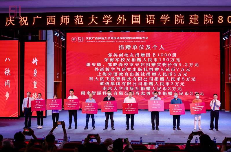 庆祝大会上,还举行了捐赠仪式。1999级校友、中运国际物流董事长荣海军,1993级校友、桂林酣客文化传播有限公司总经理谢庆聪,外语教学与研究出版社区域经理李峰、上海外国语教育出版社华南大区总经理伊静波、蓝鸽集团广西高校总监望玉良、湖南智添教育科技有限公司总经理肖志勇、北京科大讯飞教育科技有限公司等校友、嘉宾上台举牌捐赠,助力学院建设发展。