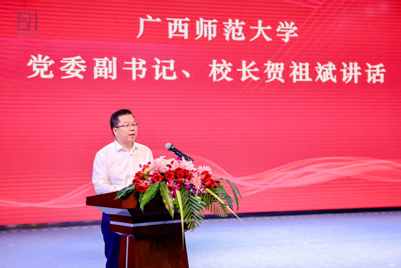 庆祝大会在全场高唱国歌声中拉开序幕。贺祖斌代表学校向外国语学院全体师生员工表示热烈的祝贺,向长期关心支持外国语学院事业发展的各级领导和社会各界朋友、校友们表示衷心的感谢!贺祖斌在致辞中高度评价和肯定广西师范大学外国语学院建院80年来,在人才培养质量、办学规模、办学条件、办学社会影响等方面取得的光辉成绩。