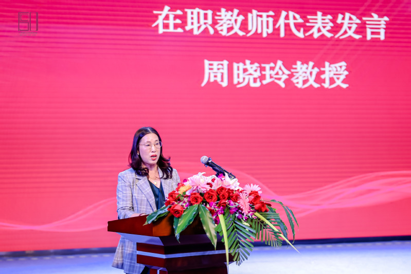 广西师范大学教学名师周晓玲教授代表在职教师致辞,她讲述了自己扎根杏坛、教书育人的历程;勉励学生们学好专业知识,讲好中国故事;她表示,外院教师团队将坚守育人初心,凝聚奋进力量,续写外国语学院辉煌。