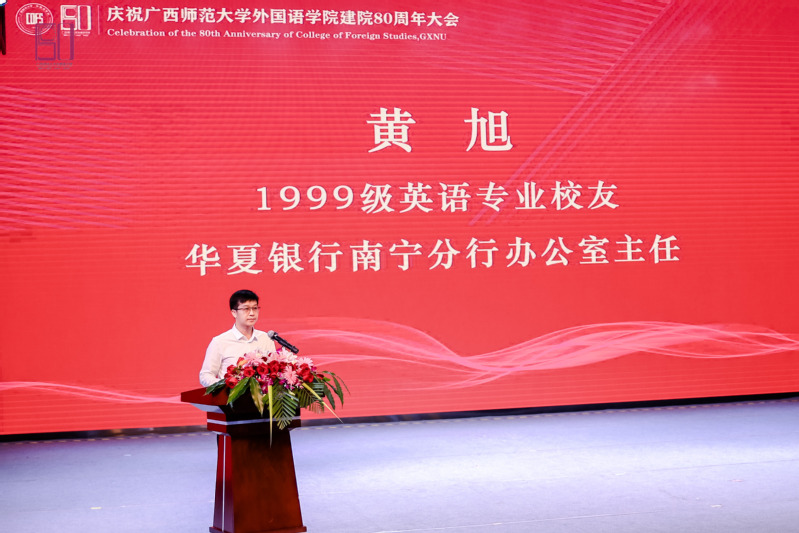 “美不美,漓江水;亲不亲,外院人”。校友代表,1999级英语教育专业毕业生、华夏银行南宁分行办公室主任黄旭深情回顾了在外国语学院学习生活的美好岁月,感恩母院教育培养,祝福母院乘势而上、再谱新篇。
