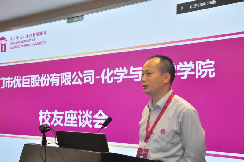 王贤文校友在会上介绍了在母校的求学经历,跟与会老师、同学分享了自己在创新创业中的宝贵经验。他说,毕业以后,一直秉承“尊师重道 敬业乐群”的校训,牢记老师的教导,利用在学校所学的知识,结合社会需求,开发具有自主知识产权的核心技术,积极开展成果转化,创立了广东省优巨先进新材料股份有限公司,公司逐步壮大,在行业里拥有自己的话语权,他表示,毕业以后一直关注学校的建设发展,今后将加强与母校在人才培养、科技开发等方面开展多种形式的合作,愿为母校的发展贡献自己的力量。