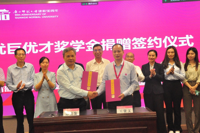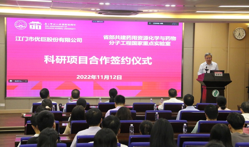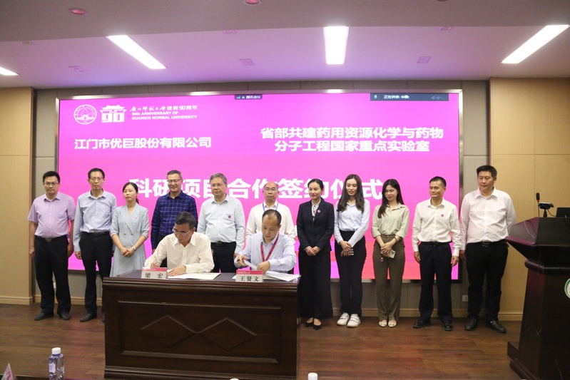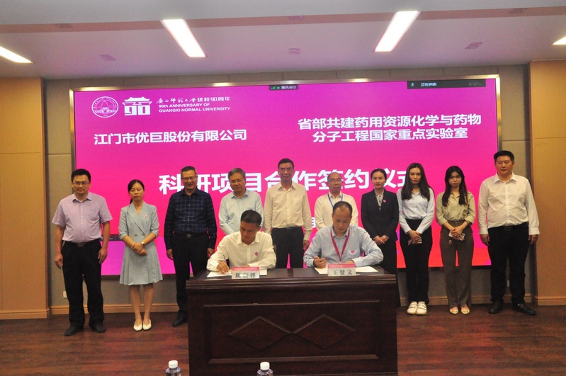 11月12日,广东省优巨先进新材料股份有限公司捐赠和项目合作签约仪式在省部共建药用资源化学与药物分子工程国家重点实验室举行,校友、公司董事长王贤文博士,广西科协副主席梁宏,副校长苏桂发,科技处、校友基金会、化学与药学学院和国家重点实验室主要负责人出席签字仪式,化药学院130多名师生见证了捐赠仪式。