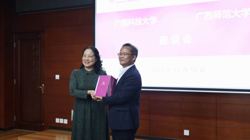 林春逸副校长向广西科技大学副校长秦小云赠送我校90周年校庆丛书