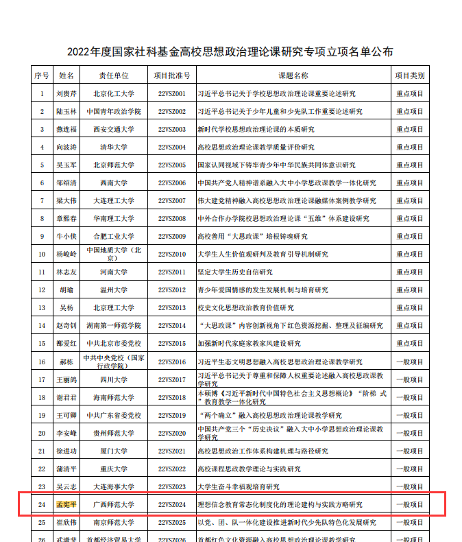 近日,全国哲学社会科学工作办公室公布了2022年度国家社科基金高校思政课研究专项立项名单,本次共有172个项目获得立项,其中重点项目15项,一般项目157项。我校马克思主义学院孟宪平教授申报的《理想信念教育常态化制度化的理论建构与实践方略研究》获得一般项目立项,这是截至目前我校获得的第3项国家社科基金高校思政课研究专项项目。