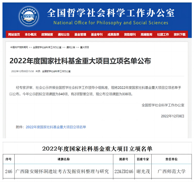 12月8日,全国哲学社会科学工作办公室正式公布2022年度国家社科基金重大项目立项名单,我校历史文化与旅游学院、华南边疆考古研究中心谢光茂研究员领衔投标的《广西隆安娅怀洞遗址考古发掘资料整理与研究》(22&ZD246)获得立项。