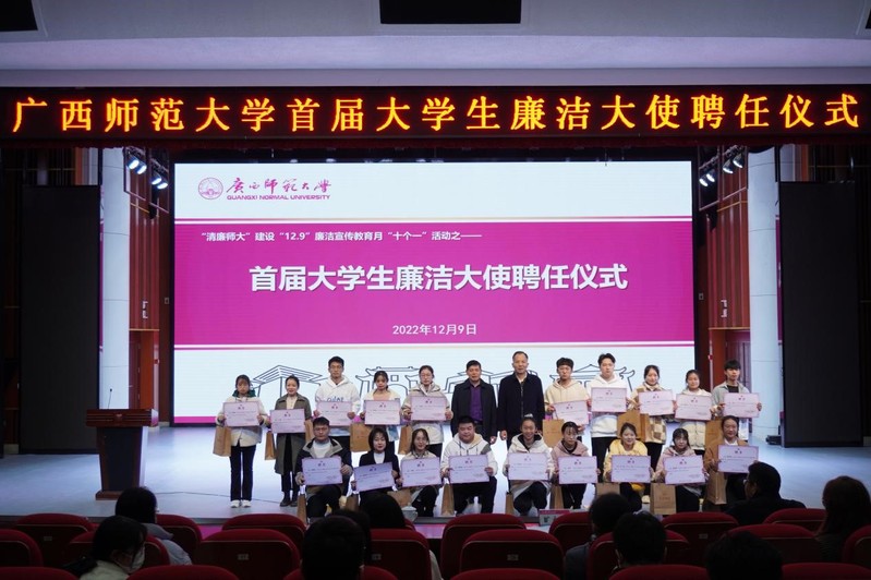 据悉,本次廉洁大使的选树聘任是我校2022年“清廉师大”建设“12.9”廉洁宣传教育月“十个一”活动的一项子活动,旨在引导和激励学校广大青年学子向上向善、见贤思齐,努力营造学榜样、当先进、做贡献的良好氛围。接下来,我校将以本次活动为契机,发挥朋辈廉洁教育引领示范作用,帮助青年学生扣好廉洁人生“第一粒扣子”,营造风清气正的校园文化氛围,为推进我校建设国内一流大学,奋力开创新时代壮美广西建设新局面,谱写全面建设社会主义现代化国家凝聚青春正气。